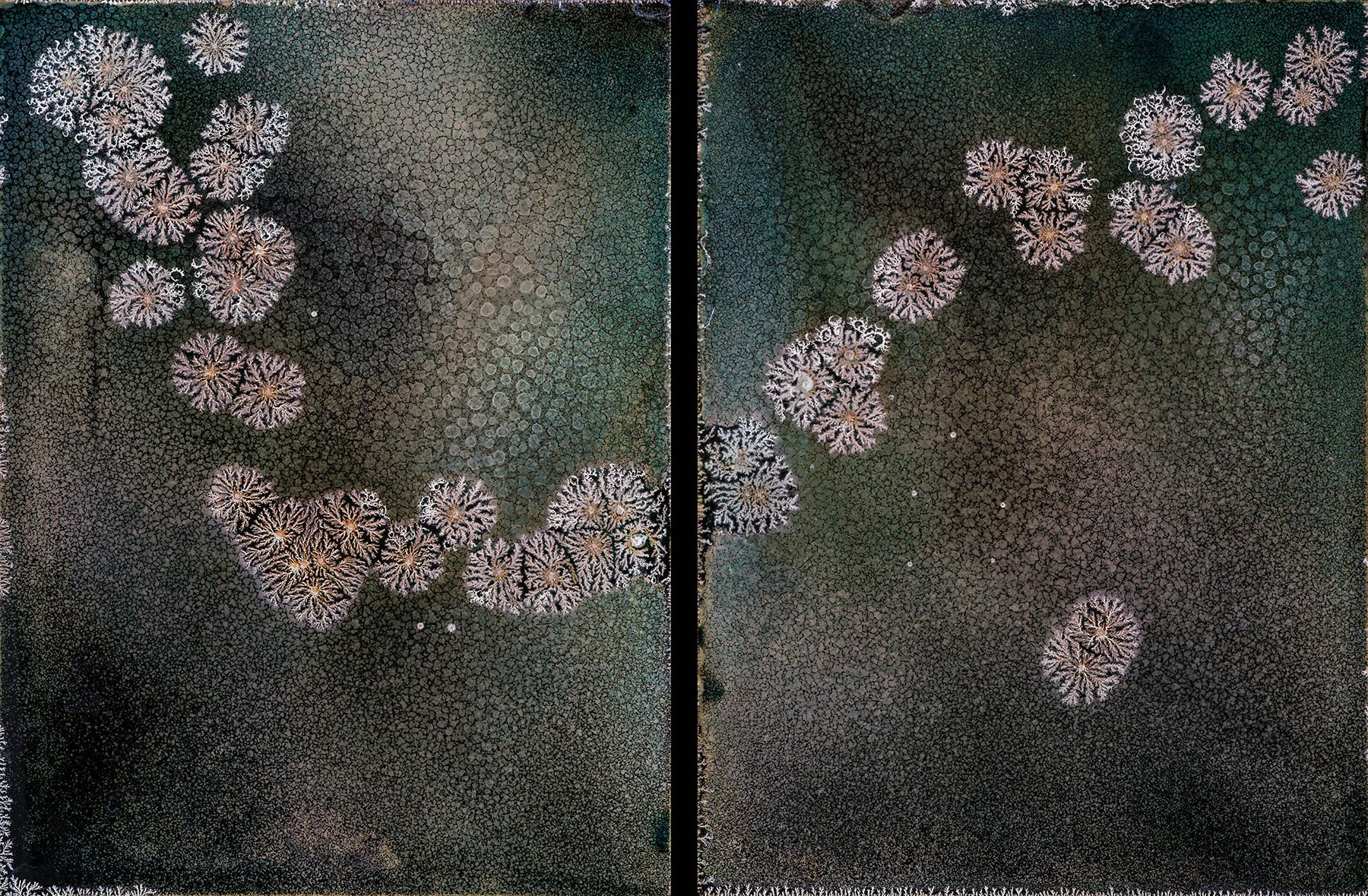 The long-term effects of severe, acute exposure to gamma radiation led directly to many future health complications for both of my parents and implicitly to genetic issues for my siblings and myself. This family medical and genetic history and my experiences with “survivor’s guilt” drive my “artist’s hand.” I like to call my art purposefully abstract. I make distinct choices in chemistry and design, but for each art piece (just like it is in genetics), the final outcome is ultimately out of our control.